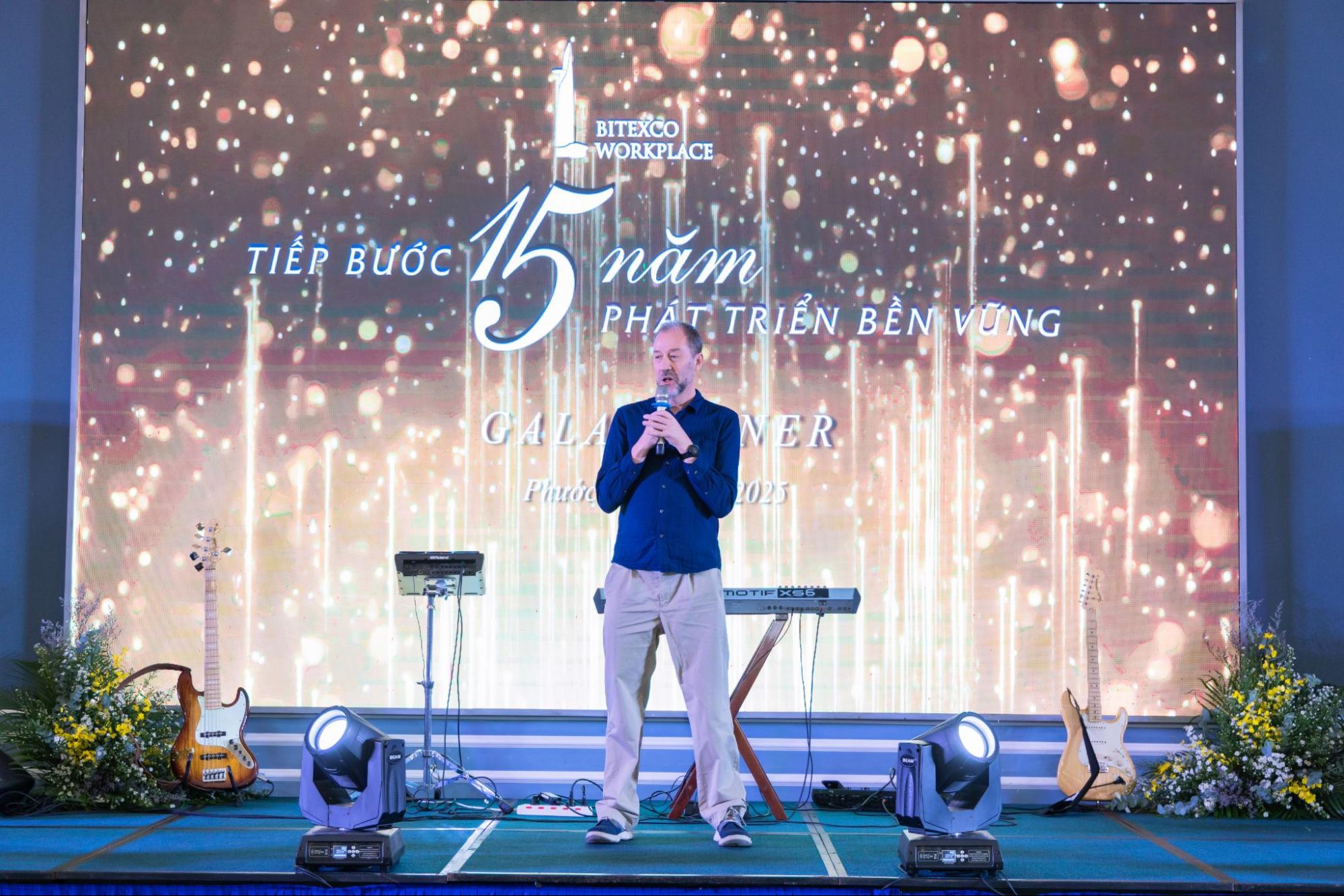 Ngay sau phần phát biểu của ông Brian, ông Phạm Thanh Thế – Giám đốc Nhân sự vùng, bày tỏ niềm vui và sự hạnh phúc khi làm tại Bitexco Group, ông nói: “15 năm vừa qua là hành trình đầy tự hào của toàn thể Cán bộ nhân viên BWP, nơi mỗi người là một mảnh ghép quan trọng, góp phần tạo nên những thành tựu và cung bậc cảm xúc của tòa tháp. Thay mặt Ban lãnh đạo, chúng tôi xin gửi lời cảm ơn sâu sắc đến từng cá nhân vì những nỗ lực, sự gắn bó và cống hiến không ngừng – những người luôn đồng hành, giữ vững và xây dựng nên giá trị biểu tượng của Bitexco Financial Tower hôm nay.