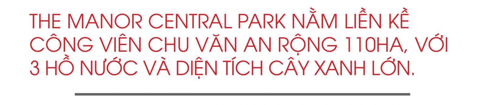 Ngay từ khi còn nằm trong ý tưởng, The Manor Central Park với diện tích 89ha, quy mô 25.000 cư dân được định vị trở thành một trong những cộng đồng cư dân đẳng cấp, giàu có bậc nhất tại Hà Nội. Vì vậy, Bitexco không ngừng phát triển các tiện ích đẳng cấp, thượng lưu và môi trường sống xanh, hoà mình cùng thiên nhiên với 6 công viên nội khu. Trong đó, công viên trung tâm Central Park có diện tích 7ha sẽ là nơi sôi động nhất của toàn dự án với những hoạt động của trung tâm thương mại dưới tầng hầm, sự kiện văn hóa, giải trí lớn ngoài trời, quảng trường, nhạc nước, những show ca nhạc hoành tráng…