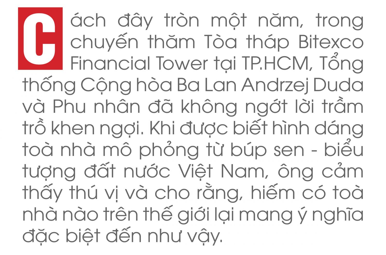 Cách đây tròn 1 năm, trong chuyến thăm Tòa tháp Bitexco Financial Tower tại TP.HCM, Tổng thống Cộng hòa Ba Lan Andrezej Duda và Phu nhân không ngớt lời trầm trồ khen ngợi.