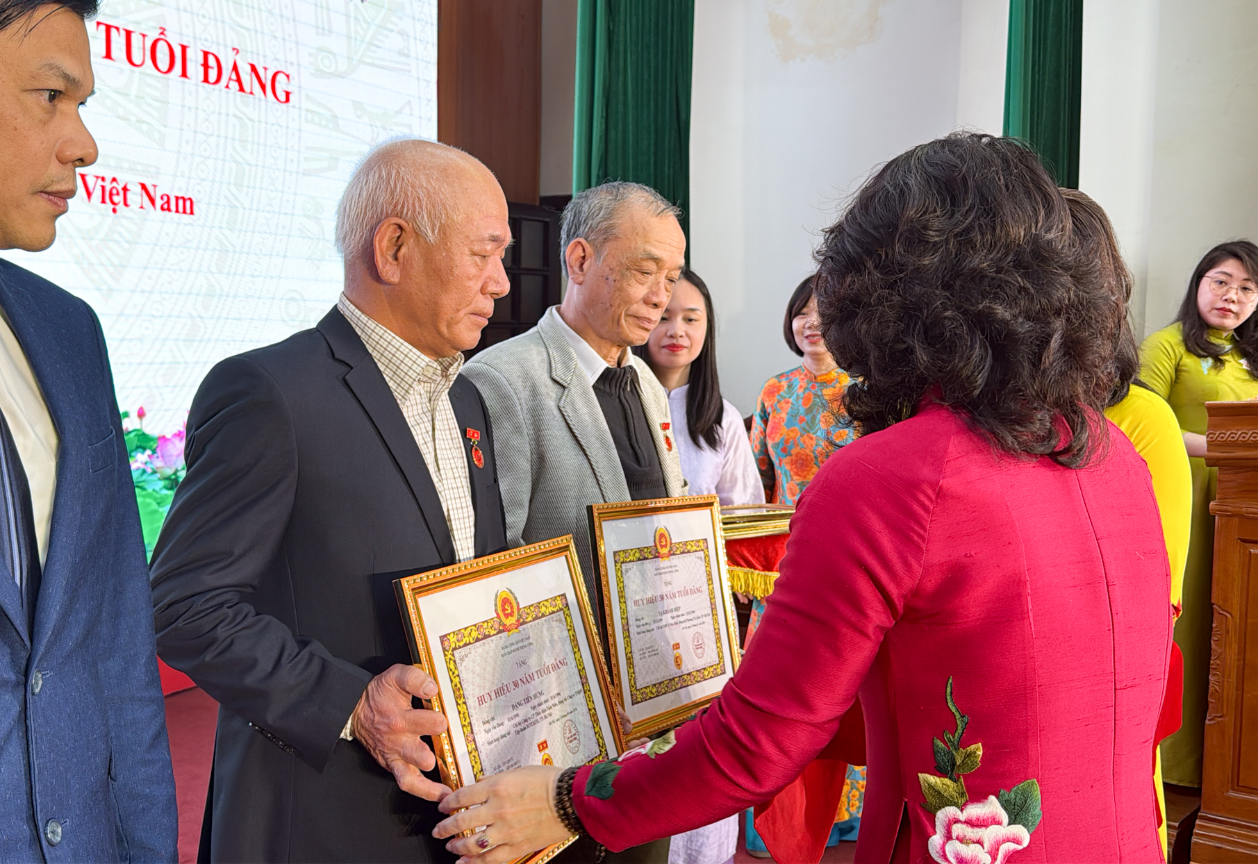 Hai đồng chí được trao tặng Huy hiệu 30 năm tuổi Đảng là đồng chí Đặng Tiến Hưng – Huy hiệu 30 năm tuổi Đảng, sinh hoạt tại Chi bộ Nậm Mức và đồng chí Bùi Xuân Đông – Huy hiệu 30 năm tuổi Đảng, sinh hoạt tại Chi bộ Năng lượng.